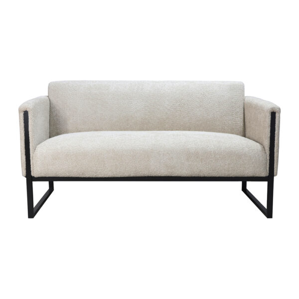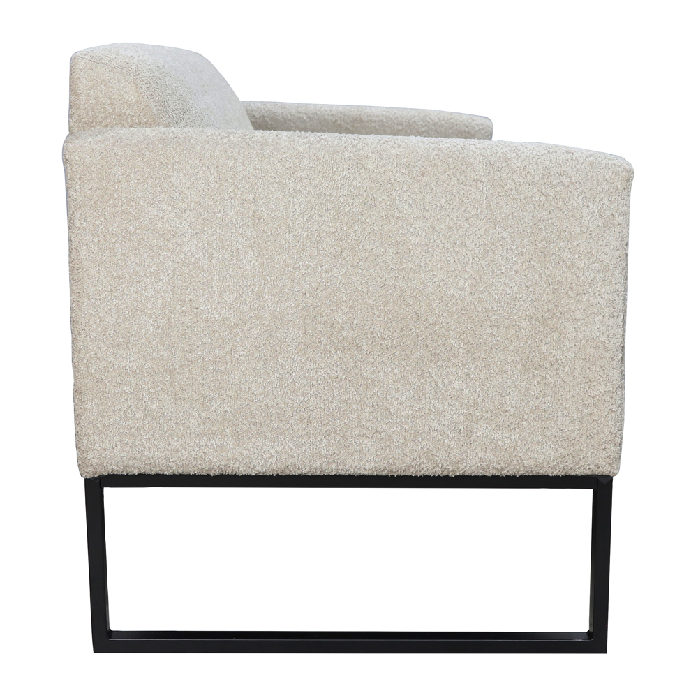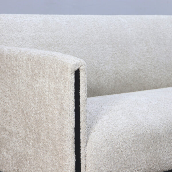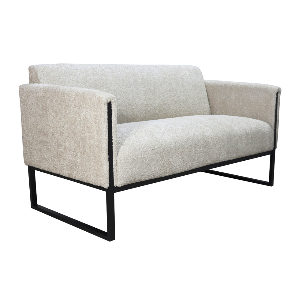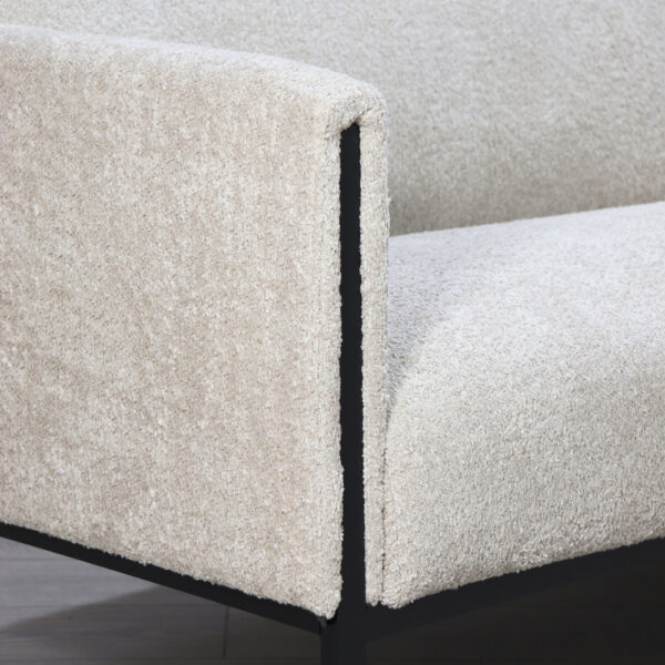 Конструкция основана на металлическом каркасе с открытым низом, что визуально облегчает мебель и создаёт ощущение простора. Такой дизайн удобен и с практической точки зрения — под диваном легко убирать. Сиденье наполнено плотным пенополиуретаном, который обеспечивает комфорт и стабильную поддержку в течение всего дня. Мягкие подлокотники подчёркивают общий стиль и добавляют уюта.