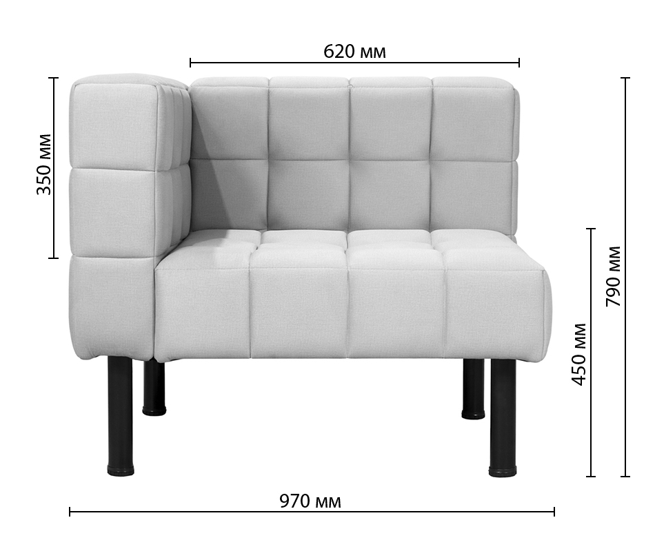 • Одинарный модуль со спинкой — обеспечивает комфортную посадку, может использоваться как самостоятельное кресло или как часть дивана.