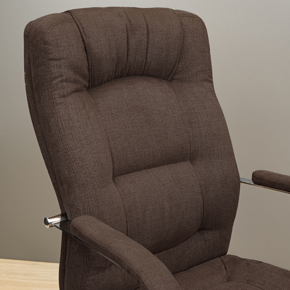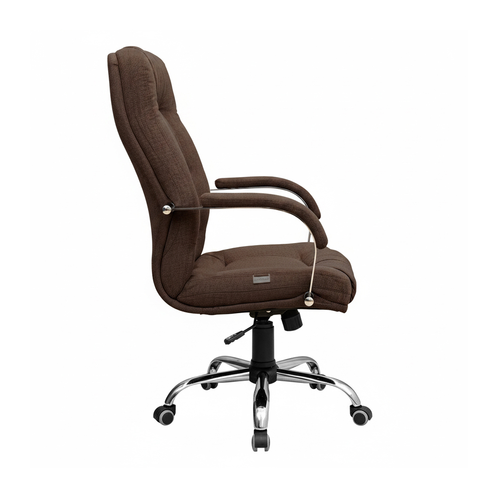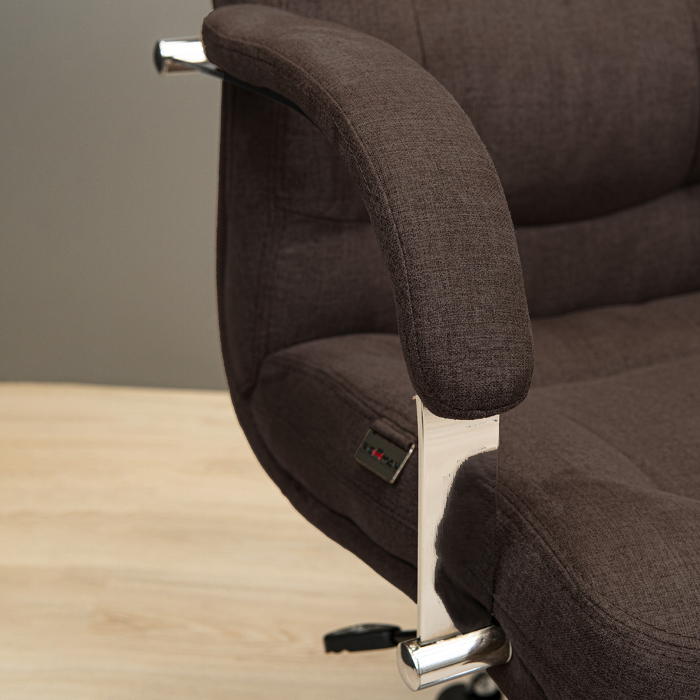 Кресло имеет хромированные металлические подлокотники с продуманной изогнутой формой, которая обеспечивает удобное расположение рук на них.