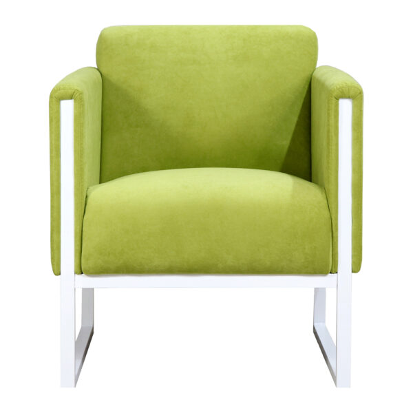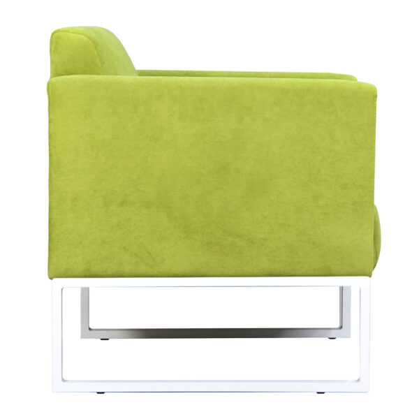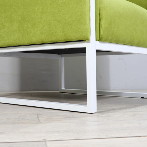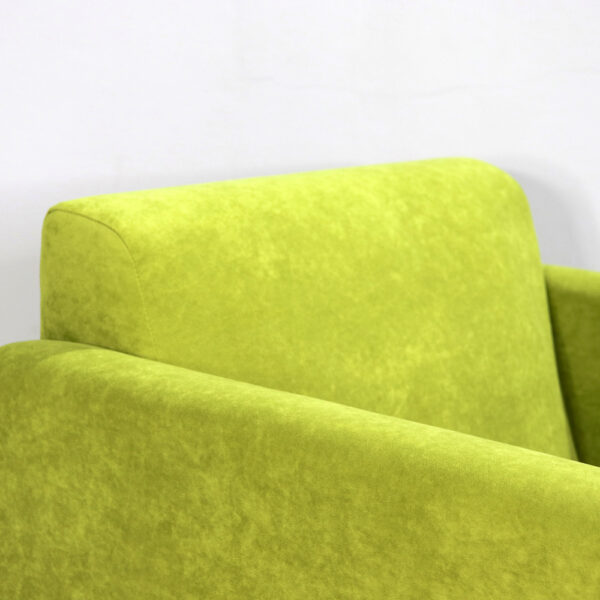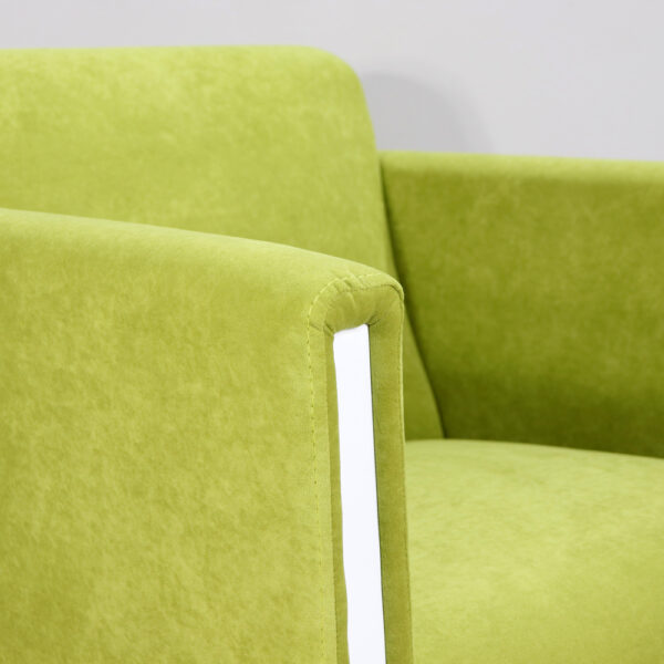 Обивка выполнена из бархатистой велюровой ткани с мягким матовым блеском, который красиво переливается в зависимости от освещения. Материал приятный на ощупь, нежный, но в то же время прочный и износостойкий. Цвет — салатовый, с тёплым подтоном, который наполняет пространство светом и позитивной энергией. Он смотрится смело, свежо и дорого — идеальный выбор для интерьеров, которым не хватает характера и настроения.