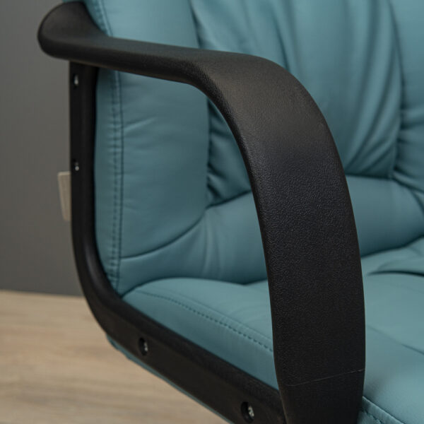 Удобные подлокотники выполнены из черного пластика. Прочная крестовина оснащена прорезиненными роликами, что позволяет бесшумно и безопасно передвигаться по полу.